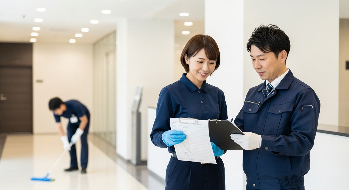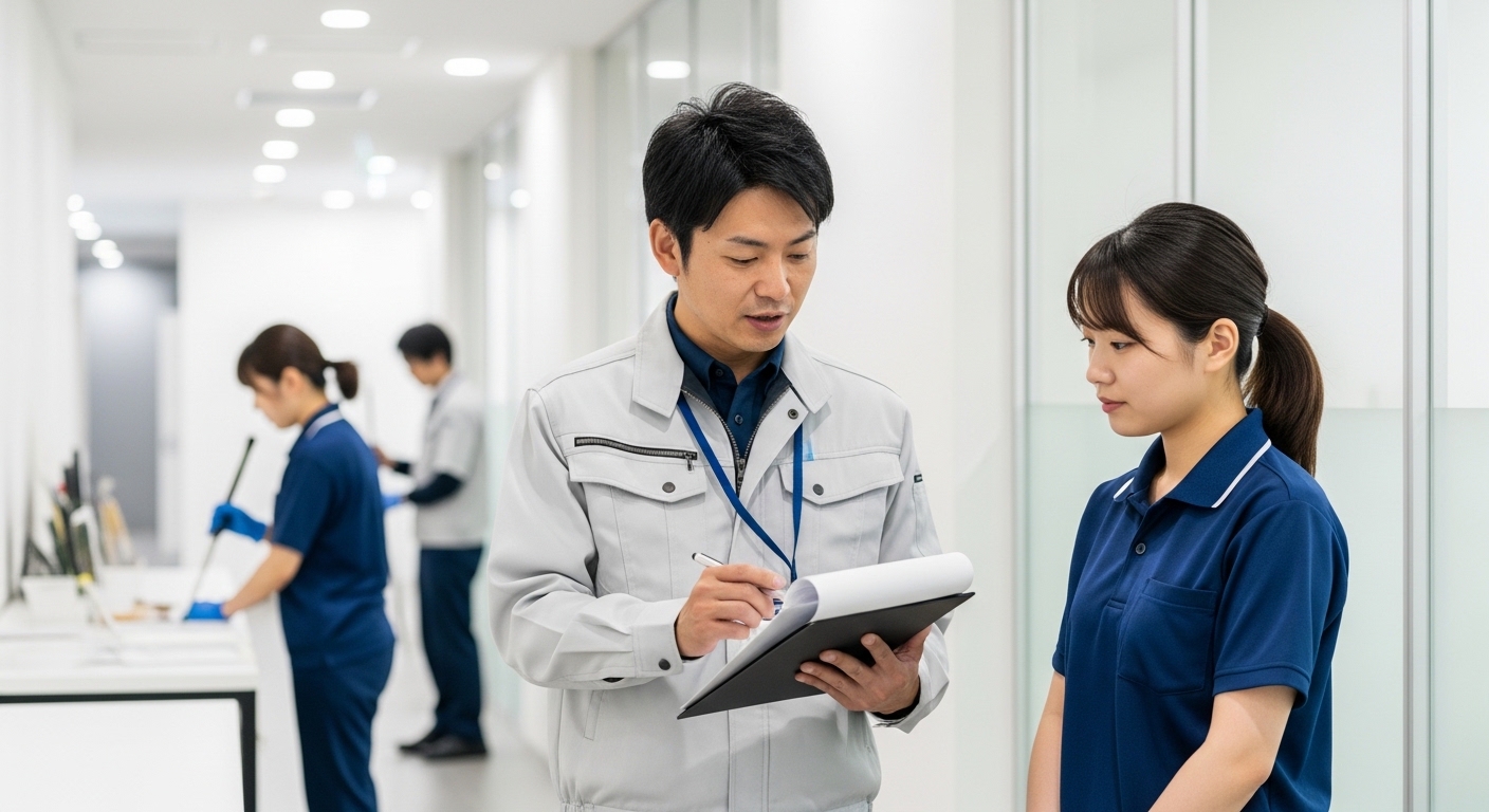 毎日の清掃が終了してから、清掃リーダーがチェック表に基づいて清掃チェックを徹底しています。毎日報告書を提出し、業務の進捗及び対応状況などを明確にします。