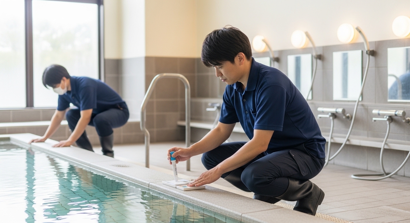 温浴施設の水質管理は、「標準化された清掃手順」と「レジオネラ対策を含む水質・塩素管理」をセットで回し、記録まで含めて仕組み化することが重要です。