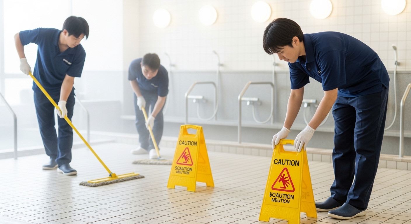 温浴施設の施設清掃における安全表示は「滑り・火傷・薬剤リスク」を見える化し、事故を未然に防ぐための最も実用的な仕組みです。