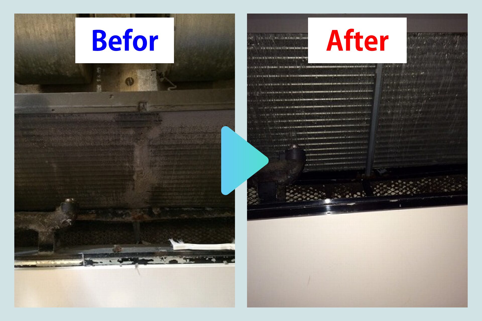 塵、埃を除塵し、こびりついていた油脂汚れを除去いたしました。今後も予定通り定期的な清掃を実施する事で機器の機能維持する事ができますのでちょうどよい清掃タイミングでご提案させていただきます。